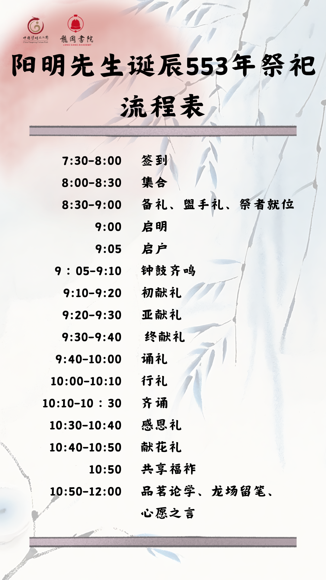 本次活动是一场具有公益性质的祭祀仪式,旨在祭祀并缅怀王阳明先生。中国阳明文化园诚挚邀请各位阳明心学爱好者共同参与,一同追思先贤、回顾历史、敬仰圣德。不忘先生之教,不负时代之托。